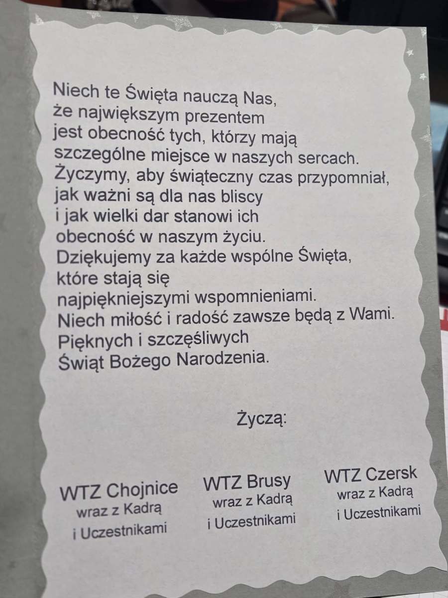 W dniu 17 grudnia 2025r., wypełniając coroczną tradycję, w imieniu Warsztatów Terapii Zajęciowych działających w naszym powiecie, delegacja z WTZ w Czersku odwiedziła Starostwo Powiatowe w Chojnicach. W ramach wizyty przekazaliśmy upominek oraz życzenia świąteczne. Każda taka wizyta jest dla nas cennym wspomnieniem.